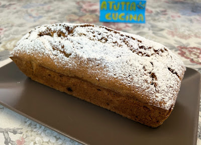 Ingredienti: 300g farina OO, 270g zucchero, 220ml thè alla pesca, 90ml olio di semi, 80g cioccolato al latte tagliuzzato, 1 uovo, 9g lievito per dolci, zucchero a velo